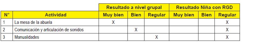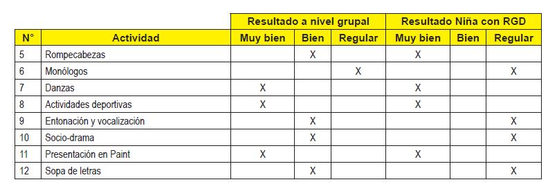 A continuación, presentamos una tabla donde comparamos los resultados de las actividades, en la niña que presenta RGD y a nivel grupal.