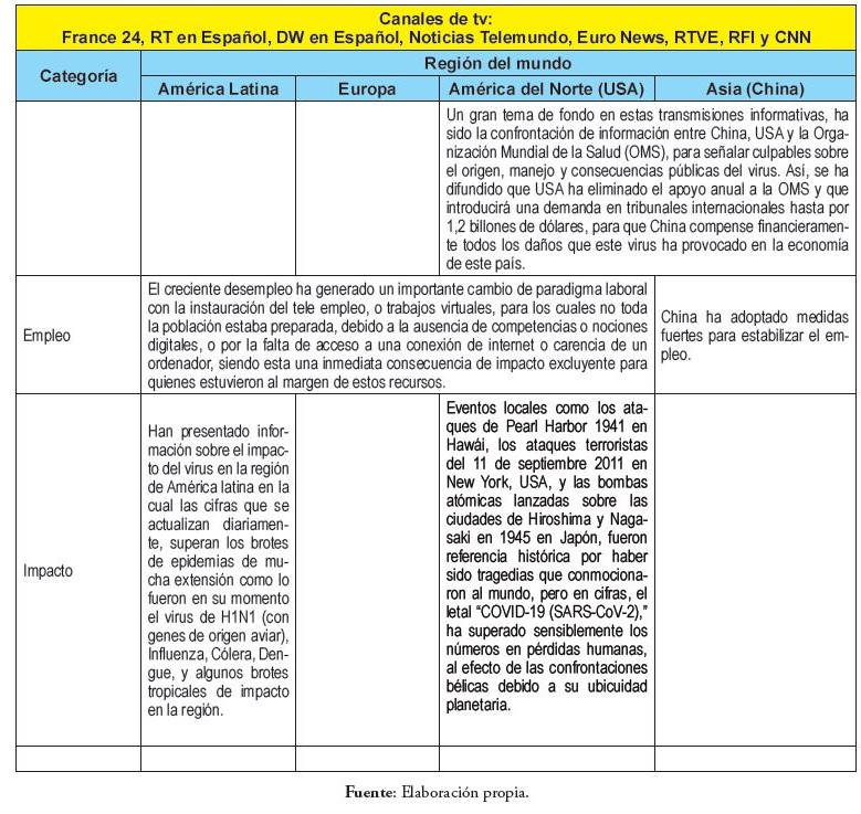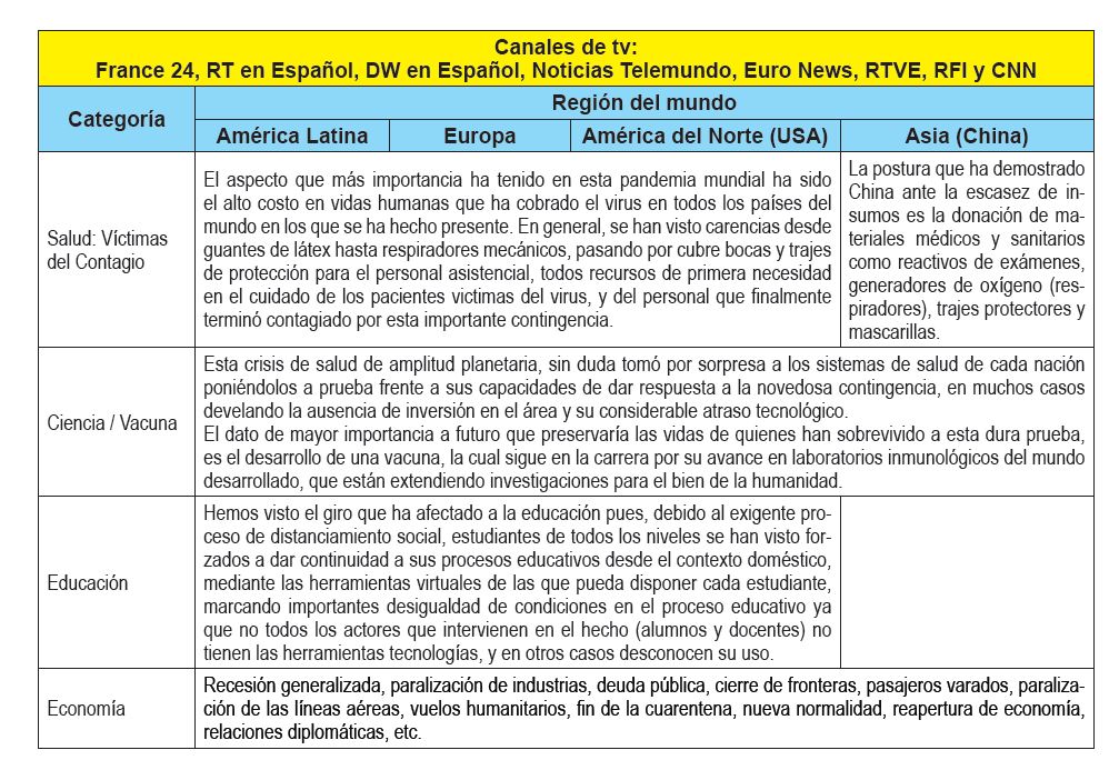 A continuación se presenta un cuadro que refleja la sistematización de la noticia recabada en los noticieros entes mencionados. Para esto fue importante definir categorías y regiones del mundo, las categorías son: salud, ciencia, educación, economía, política, empleo e impacto. En cuanto a las regiones tenemos América Latina, Europa, América del Norte (USA), Asia (China).