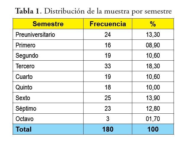 Se envió una invitación para participar en el estudio a 316 estudiantes activos de la Carrera de Odontología de la Universidad de Los Hemisferios, Quito, Ecuador. De estos, 180 respondieron el cuestionario oportunamente, quienes cursan los distintos semestres de la carrera (Tabla 1), lo cual representa el 57% de la nómina de los estudiantes.