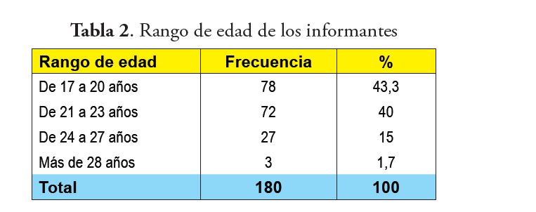 La edad de los participantes oscila entre 17 y 32 años (tabla 2); el 68% (n = 122) corresponde al sexo femenino. Según los datos aportados por la unidad de Gestión Académica de la Universidad de Los Hemisferios, cerca del 60% de los estudiantes provienen de colegios particulares, religiosos o laicos; el 40% restante estudió en instituciones fiscales, municipales y fiscomisionales (educación pública y subvencionada).