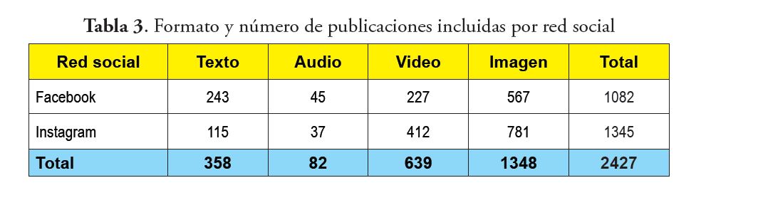 El análisis de las publicaciones en Facebook e Instagram indica los participantes son usuarios activos de estas redes sociales. En la Tabla 3, se observa el número de posts publicados y los distintos formatos durante el mes de mayo. Se observa que publicaron o compartieron un gran número de posts en diferentes formatos.