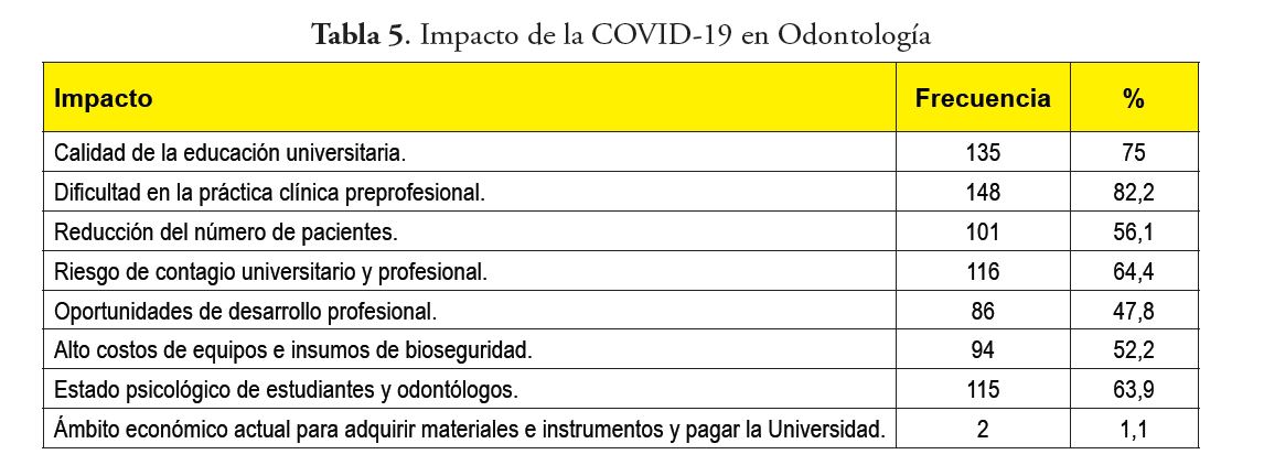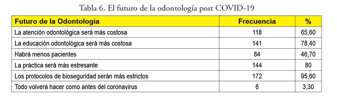 Finalmente, las preocupaciones económicas expuestas coinciden con Farooq y Ali (2020), quienes han advertido sobre las implicaciones económicas y financieras de la COVID-19 para la práctica odontológica, tanto en el ámbito de las empresas que prestan los servicios como en el dominio laboral de los odontólogos.