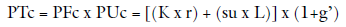 [1]Se examinará lo correspondiente a los agentes capitalistas. El Precio Total de la producción capitalista PTc, también por definición, es igual a su producción física de mercancías PFc, multiplicada por el precio unitario de estas mercancías Puc. De otro lado, esto normalmente debe ser igual a una suma que equivalga a su inversión aumentada en una tasa de ganancia media. Su inversión está compuesta, de una parte, por una cantidad física de bienes de producción (que la economía neoclásica llama capital físico y aquí se denotará por K), multiplicada por el precio de estos bienes, que se denotará con r. La otra parte de su inversión son los salarios que paga, que a su vez consistiría en la cantidad de horas de trabajo compradas L, multiplicadas por el salario unitario, que es su precio: su. Esta inversión debe ser aumentada en proporción a la tasa de ganancia media g’, es decir, debe ser multiplicada por (1+g’).