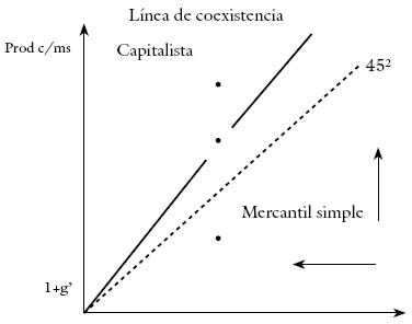 Pero, de otro lado, en la expresión [5] se ve que la variable dependiente Prodc/ms es una función lineal de (1+g’), cuya pendiente sería precisamente el resto de la expresión (es decir [(K/L) x r/iu] +1), que a su vez es una magnitud mayor que 1. En la figura 1 se tiene una expresión gráfica de este esquema. Ilustra la relación entre la productividad relativa y la tasa de ganancia (1+g’). Cada eje corresponde a una de estas variables. La línea de coexistencia muestra los valores que son compatibles, bajo las restricciones mencionadas, con la operación simultánea de agentes capitalistas y mercantiles simples. Es una recta cuya pendiente es superior a 45 %, por las razones que ya se han mencionado en el párrafo anterior. El espacio a la izquierda y hacia arriba mostraría valores de la productividad relativa que favorecen que la producción capitalista desplace a la producción mercantil simple. El área bajo la línea de coexistencia y hacia la izquierda corresponde a niveles de productividad relativa en los que es la producción mercantil simple la que se impone.