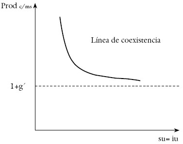 Otro aspecto que ilustra de manera muy elocuente esta representación tiene que ver con la relación entre la productividad relativa y el nivel salarial en condiciones de coexistencia. Si se examina la ecuación [6] (que es la misma ecuación [5] pero sustituyendo iu por su equivalente su), se ve que cuando el salario tiende a 0, la productividad relativa tiende al infinito para que exista coexistencia. Cuando el salario tiende a infinito, la productividad relativa tiende a (1+g’) como está ilustrado en la figura 2. Como se ve, y esto también parece algo paradójico, a los capitalistas les cuesta más trabajo desplazar a los productores mercantiles simples cuando el nivel del salario es bajo, que cuando es alto.