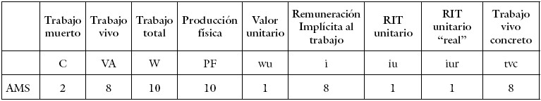 Se le llama valor unitario (denominado como wu) a la cantidad de trabajo social que condensa cada una de las unidades físicas producidas. En este caso, como el valor total es 10 y las unidades físicas son 10, cada una de estas unidades de producto condensa una unidad de valor: wu=1.