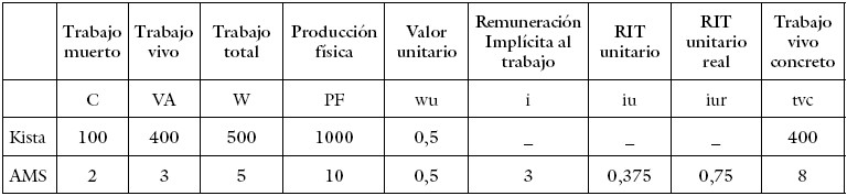 Ahora, se puede contemplar la posibilidad de que en esta economía irrumpa un agente capitalista. Se puede suponer que los agentes capitalistas tienen dos características: de una parte, tienen una talla mayor, son capaces de movilizar una cantidad mayor de trabajo, tanto vivo, como muerto. De otro lado, se va a suponer que esta mayor escala de operación les permite emplear técnicas más productivas, pues, proporcionalmente, pueden producir una mayor cantidad de bienes físicos con cantidades similares de trabajo. También se va a suponer que la relación entre trabajo muerto y trabajo vivo es igual a la de los agentes mercantiles simples que son sus competidores, es decir, que lo que los neoclásicos denominan “relación capital/ trabajo” es la misma. Entonces, la escala de producción de los agentes capitalistas es 50 veces la de un agente mercantil simple, se produce con 100 unidades de trabajo muerto y 400 unidades de trabajo vivo, por lo que el valor total producido es de 500. Pero esta unidad productiva capitalista es más eficiente, pues si el trabajo involucrado en ella se multiplica por 50 en relación con la producción mercantil simple, la cantidad física producida lo hace por 100; se producen 1000 unidades físicas de producto. Por lo tanto, el valor unitario wu se reduce a 0,5, pues cada unidad física de producto condensa media unidad de trabajo. Esto está consignado en el primer renglón de la tabla 2.