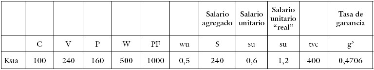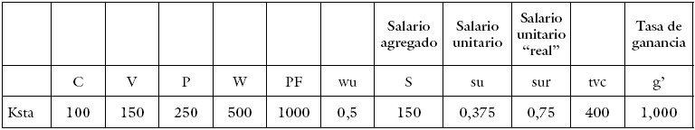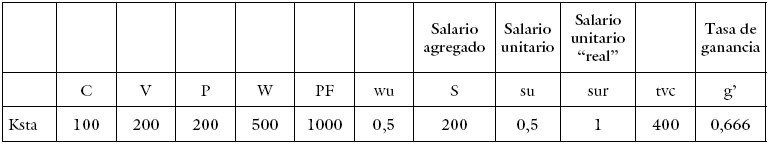 En este caso, el trabajador asalariado debería obtener un salario unitario, por unidad de tiempo trabajada, que le permitiera obtener en el mercado una unidad física del bien, que es lo que obtenía como agente mercantil simple por unidad de tiempo trabajada. A esto se lo llamará “salario unitario real (SUR)” y debería ser igual, en este caso, a la remuneración implícita al trabajo unitaria real IUR que, como se ha dicho, es igual a 1. Como el valor y el precio del bien es 0,5, esto es lo que hay que pagarle al trabajador por unidad de tiempo trabajada para que él pueda comprar una unidad del bien por cada unidad de tiempo trabajada. En términos agregados, como el trabajo vivo global es de 400 horas, por ellas el capitalista pagaría un salario global equivalente a 200 unidades de trabajo social. Este salario global S no es otra cosa que lo que el capitalista paga como capital variable V. De esta forma, el capitalista pagando 200 unidades como capital variable puede conservar el complemento del Valor Agregado, o el equivalente monetario del trabajo vivo, en términos de Plusvalía. En este caso, esta plusvalía sería de 200, que es lo que alimenta la ganancia del capitalista. La tasa de ganancia sería de 0,666, ya que el capital que desembolsa el capitalista es de 300 (100 de capital constante y 200 de capital variable) y la plusvalía es de 200.