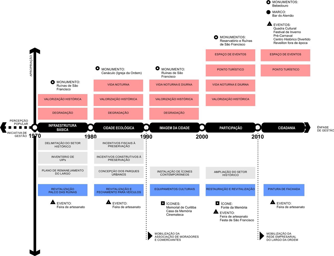 Os resultados demonstram a vocação histórica do Largo da Ordem como espaço cultural. Seu reconhecimento como patrimônio arquitetônico aparece periodicamente, principalmente na valorização e resgate de monumentos históricos (com enfoque nas Ruínas de São Francisco, o Belvedere e o Bebedouro). A partir de 2000, especialmente com as ações da Rede Empresarial do Largo da Ordem (após 2010) o Setor Histórico se potencializa como sede de múltiplos eventos e esta nova característica faz do ano 2000, a linha de corte para que o espaço minimize sua associação como endereço de violência e degradação (figura 5).