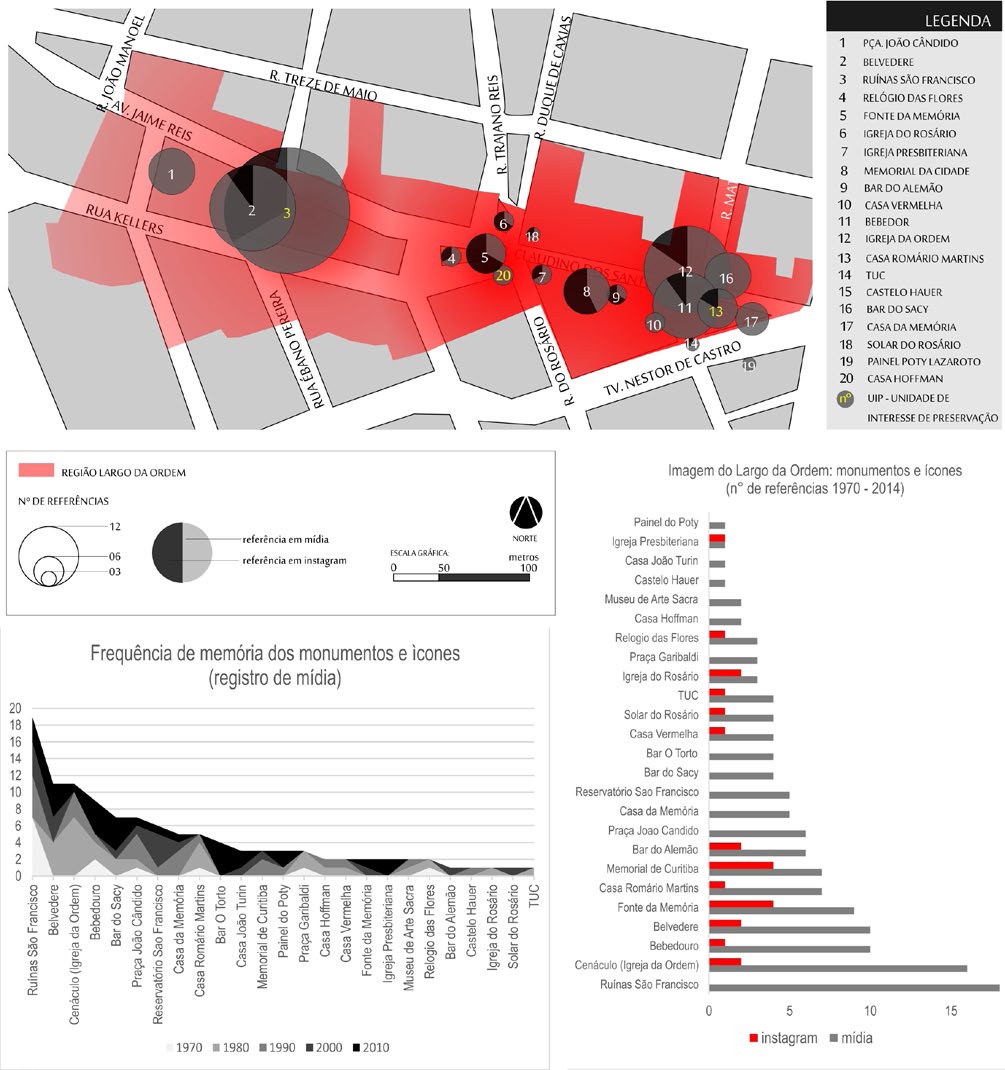 Considerando a imagem da memória popularmente atribuída ao Largo, com fonte nos registros mais atuais – Instagram em 2015 –, novamente são os ícones contemporâneos que mais figuram como pano de fundo dos espaços mais apropriados neste contexto, destacando-ícones contemporâneos – enfatiza o mose a Fonte da Memória e o Memorial de do como a memória do Largo permanece Curitiba (figura 6). Este deslocamento da inerte à dinâmica de renovação da cidade referência histórica – dos monumentos aos e às pressões da verticalização temporal.
