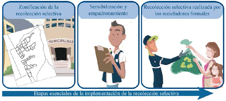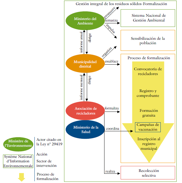 La Ley del Reciclador N.º 29419 busca fomentar la formalización de los recicladores y el establecimiento del recojo selectivo mediante la integración de estos actores informales. Para ello, las municipalidades distritales tienen dos misiones: formalizar a los recicladores e implementar el Programa de segregación a la fuente y de recolección selectiva (PSF-RS). Para integrar estos actores informales en su sistema local de gestión de residuos sólidos, definen un proceso administrativo (ver figura 2) por ordenanza municipal y que varía de un distrito a otro. Entonces, las municipalidades ponen en marcha el proceso administrativo. Este proceso comienza con una convocatoria a los recicladores. Se registran y obtienen un comprobante que les da acceso a la formación obligatoria y a una campaña de vacunación. Por último, los recicladores que siguieron este proceso tienen que registrarse en el registro municipal bajo forma asociativa, que les da derecho a colectar los residuos reciclables.