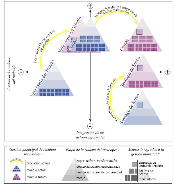 Los modelos actuales de manejo de los residuos reciclables de las municipalidades de Santiago de Surco, Comas y de Villa María del Triunfo no son estáticos. Estas municipalidades tienen proyectos en realización: una se orienta en favor de la integración de los recicladores, la otra construyendo un centro de transferencia-empresa comercializadora y la última, deseando integrar a los acopiadores.