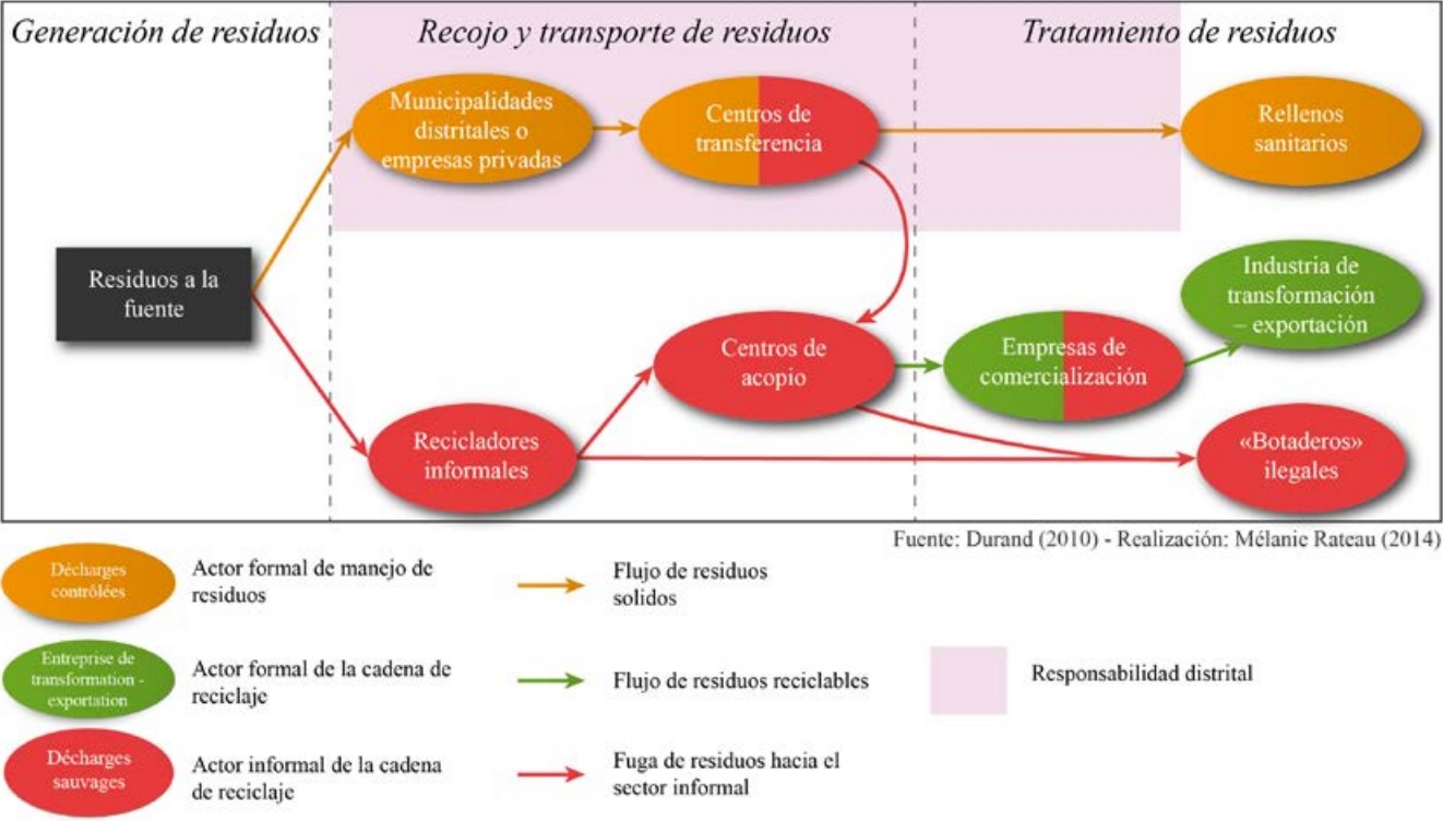La metrópoli de Lima está dividida entre dos municipalidades provinciales (Lima y Callao) y cincuenta municipalidades distritales. Las primeras son responsables de la planificación del manejo de residuos municipales y de su eliminación, en tanto las segundas se encargan de la prestación de servicios de barrido de calle, recolección y transporte de residuos a las instalaciones de eliminación (Ley General de Residuos Sólidos, 2000). Estas tareas pueden ser realizadas directamente por los servicios municipales o confiadas a un prestador de servicio privado. La gestión de los residuos está motivado por un fin de servicio público higienista de evacuación de desechos fuera de la ciudad (Barles, 2005). En paralelo de este sistema higienista formal (ver figura 1), se desarrollan estrategias de recuperación de los residuos reciclables por parte de actores informales conscientes de sus potenciales económicos (Furedy, 1992).