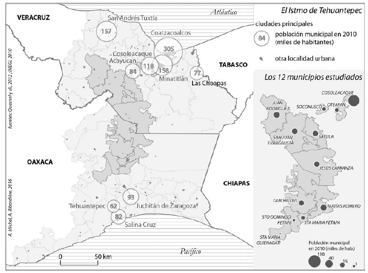 Concentramos nuestras observaciones en doce municipios de la región de Tehuantepec, ubicados en dos Estados del sureste mexicano (Veracruz y Oaxaca), que son representativos de las zonas rurales y periféricas de la región del istmo y en los que un cierto número de pequeñas ciudades registraron un crecimiento demográfico durante los últimos veinte años. En una primera parte, contextualizaremos la zona de estudio en la historia de su poblamiento para poder entender las dinámicas actuales, observando a partir del censo el origen de las poblaciones que han llegado recientemente y el destino de las poblaciones que han abandonado estas localidades durante el período reciente. Mostraremos que el crecimiento de las pequeñas ciudades y las formas de urbanización inducidas se inscriben en dinámicas de movilidad importante, especialmente en el sureste mexicano que actualmente se encuentra en un ciclo migratorio intensivo (Quesnel, Saavedra, & Tallet, 2012).