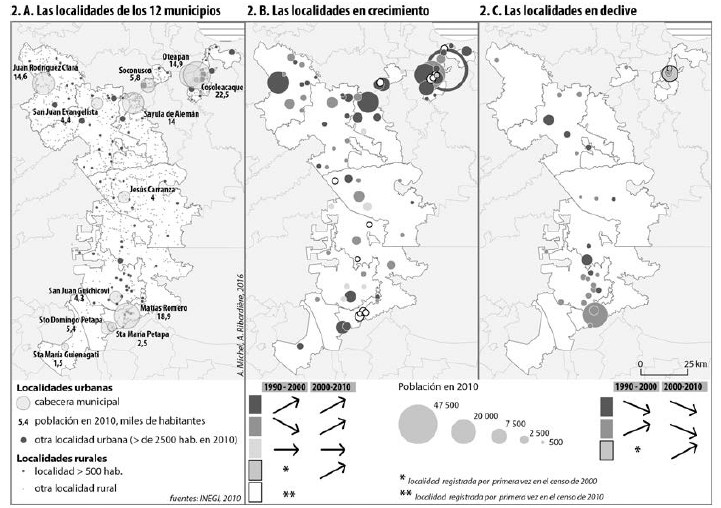Un cierto número de pequeñas localidades, que cuentan aproximadamente con 2 500 habitantes, también han experimentado crecimientos notables en el último periodo censal. Es, en primer lugar, su función de pueblo —más que ciudad18—la que explica su dinamismo demográfico.