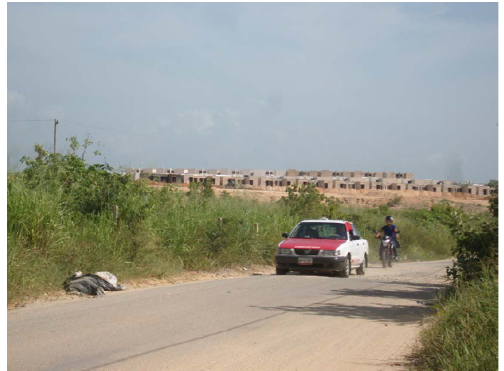 La particularidad de estas urbanizaciones es que están construidas en parcelas en total discontinuidad con la trama urbana existente, tanto en el caso de la periferia metropolitana como de la cabecera municipal. De hecho, estas construcciones están determinadas por oportunidades relativas a la propiedad de la tierra que no abundan en el contexto mexicano: el territorio de la mayoría de los municipios de la región está formado por ejidos (tierras colectivas inalienables atribuidas por la Secretaría de Reforma Agraria de 1930 a 1992). Desde la ley de 1992 que reforma la legislación agraria, los titulares de una parcela ejidal tienen la posibilidad de solicitar su plena propiedad y cederla (por venta o de otra forma), con la condición de que la asamblea del ejido y su consejo aceptaran el procedimiento de privatización. Ahora bien, los municipios vecinos de Minatitlán o de Acayucan son en su mayoría heredados de las comunidades indígenas (de lengua populuca), que han mantenido prácticas comunales relativas a la propiedad de la tierra. Son raros los ejidos que aceptan cambiar de régimen y aun cuando las parcelas son tituladas, la presión social del consejo ejidal puede ser muy fuerte. Así, a menudo “en medio de la nada”, es donde los grandes grupos consiguen adquirir una parcela para su urbanización (figura 4). Sin embargo, las consecuencias de esta localización son pesadas, para los habitantes y para los municipios.