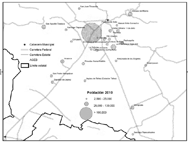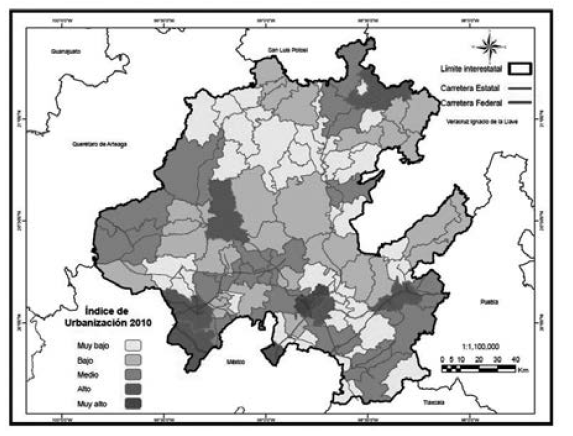 De la misma manera, el índice de urbanización3, representado en el mapa de la figura 3 de forma descriptiva por la presencia de población, construye una razón de concentración de población urbana. El único municipio que presenta un índice muy alto de urbanización es Pachuca de Soto, mientras que los municipios con índice alto de urbanización son Huejutla, al norte del estado; Ixmiquilpan, en la zona centro; Tepeji del Río y Tula de Allende, en la parte suroeste; Tizayuca, en el sur; Mineral de la Reforma, en el centro-sur; y Tulancingo, al sureste. Si se realiza una comparación con los municipios metropolitanos presentados en el mapa de la figura 2, no hay relación entre el grado de urbanización y la condición metropolitana, por lo que se presenta la necesidad de tener en cuenta un mayor número de variables y diversidad de escalas.
