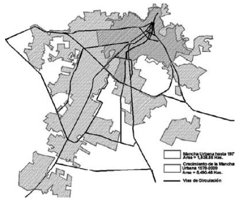 Como parte del escenario de la conjunción urbana en la ciudad de Pachuca —que surge a partir de su auge minero— se configuró lo que se conoce como la zona centro, con distintas configuraciones posteriores, hasta llegar a una traza semiradiocéntrica y radial constreñida por la morfología haca el norte; esto según el Plan Municipal de Desarrollo Urbano (PMDU) de Pachuca del Ayuntamiento, 2009-2012. El crecimiento de Pachuca se ha dado principalmente hacia los extremos oriente-poniente y, principalmente, al sur de la mancha urbana (figura 5), debido a las limitaciones que impone el espacio y por la accesibilidad a áreas planas o de someros lomeríos.