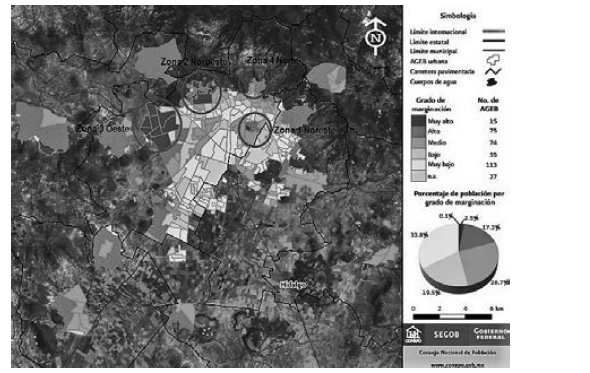 El Consejo Nacional de Población sostiene, bajo otras mediciones, que dichas zonas de residencia indígena son las que presentan un mayor grado de marginación urbana6. Según el mapa de la figura 11, las áreas geoestadísticas básicas (agebs) cuentan con un grado de marginación muy alto y alto, y según CONAPO la marginación se asocia a carencias e incapacidades, a privaciones e inaccesibilidad a bienes y servicios en escenarios de elevada vulnerabilidad social, cuya mitigación escapa del control personal o familiar (CONAPO, 2011 y 2012). Esto es producto de un modelo que no brinda a todos las mismas oportunidades. Las desventajas ocasionadas por la marginación son acumulables y configuran escenarios cada vez más desfavorables.