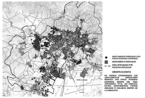 Fuente: Plan Municipal de Desarrollo Urbano del Ayuntamiento de Pachuca, 2009-2012.Por último, y como ejemplo de estas clasificaciones, se describe la zona norponiente donde se encuentra el panteón municipal, con tierras ejidales, donde se experimentó un proceso de invasiones sucesivas impulsadas por organizaciones corporativistas. Una vez asentados, se inició la dotación de servicios y se conectaron las distintas redes de asentamientos consolidados y cercanos o en las inmediaciones de otros desarrollos planeados.