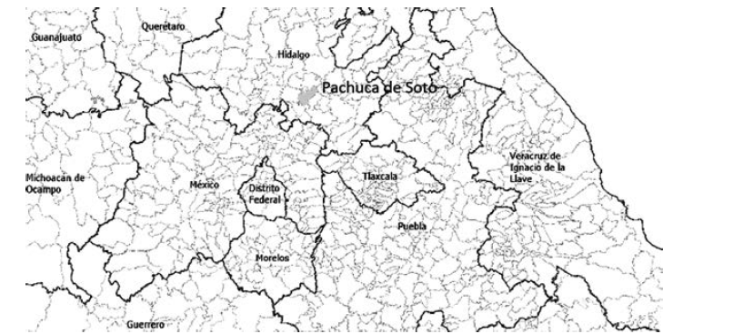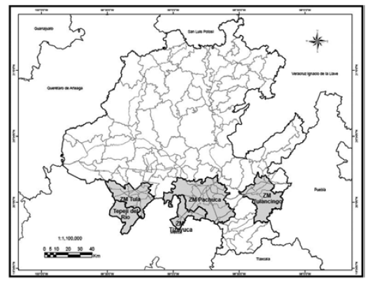 Como lo muestra el figura 2, los municipios que se articulan al proceso metropolitano de la Ciudad de México e Hidalgo se encuentran al sur del estado. Este territorio cuenta con una población de 1 364 143 habitantes en una superficie de 5 175,8 km2 y una densidad promedio de 264 habitantes por km2. Esta parte del territorio hidalguense cuenta con el apoyo financiero del Fondo Metropolitano para desarrollar los estudios y programas antes mencionados.