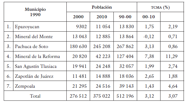 La ZMP tiene una extensión territorial de 1196,5 km2 y una densidad media urbana promedio de 76,30 h/hc. Comprende siete municipios, de los cuales Pachuca y Mineral de la Reforma sobrepasan el criterio de centralidad, con más de 50 mil habitantes y conurbación física. En solo veinte años duplicó casi su población total (INEGI, 2010) (tabla 1).