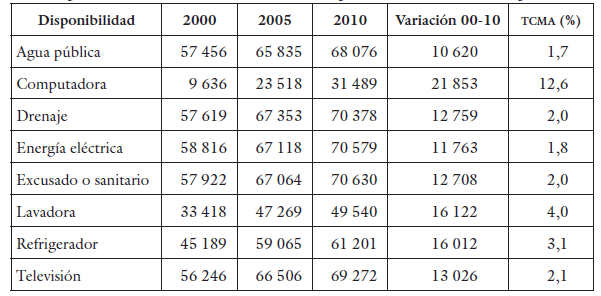Sin embargo, al analizar las condiciones para la presencia de los servicios básicos en espacios urbanos como Pachuca, que por el simple hecho de ser un espacio urbano por concentración de población, los servicios, el consumo de insumos electrodomésticos —sin saber nada sobre las fuentes de empleo— cuentan con un alza (tabla 2), se ve que el aumento en promedio es de 14 000 viviendas con servicios, pero no se asegura que las viviendas del año 2000 y sus habitantes hayan mejorado su acceso para el 2010. Esto significa efectivamente un mayor número de viviendas; no obstante, los servicios no están en las viviendas anteriores, o ya establecidas, sino en los nuevos desarrollos habitacionales que son apoyados por las desarrolladoras e instituciones municipales.