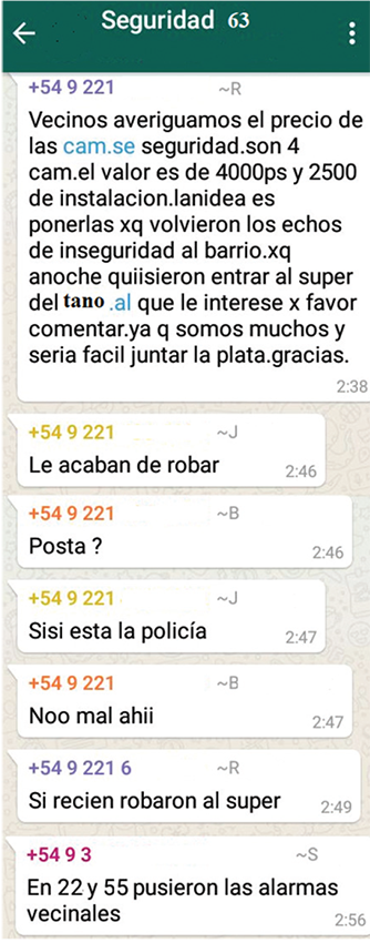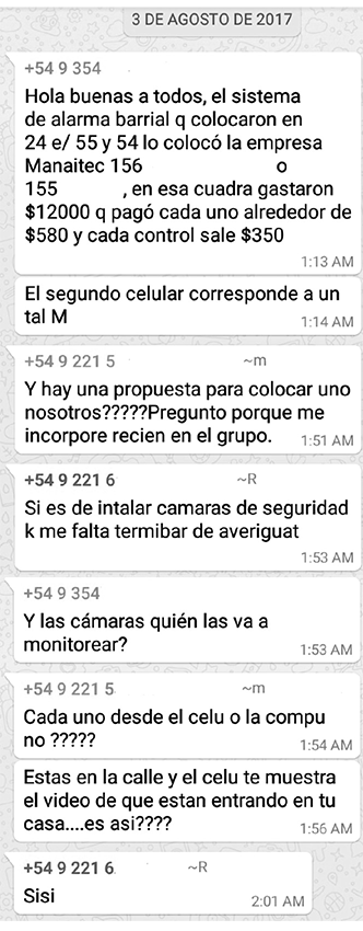 En la esquina de la cuadra, a unos 15 metros de la casa de Paula, hay un almacén que fue robado varias veces durante los meses anteriores a la creación del grupo de mensajería. Una de las últimas ocasiones en que tuvo lugar el hecho delictivo, llamó en parte la atención de los vecinos/as no se hubiesen enterado por los almaceneros, y se manifestó la no conformidad de estos en relación con instalar cámaras o contratar alguien que vigile. Allí también tomé conocimiento de que hay presupuestos que varían según se contraten servicios de la comisaría del barrio (provincial), de la policía federal o un servicio privado. El hecho es que todos/as los/as vecinos/as tenían que poner dinero mensualmente y esto dificultó que las personas accedieran; la no participación del comercio generó algunas distancias (uno de los almaceneros se fue a trabajar a un comercio de otra zona de la ciudad). Esto nos sirve de indicio para considerar que la seguridad y las tomas de decisión respecto del espacio habitado en este asunto no siempre unen a los/as vecinos/ as y comerciantes, lo que evidencia lo contingentes y heterogéneos que pueden resultar estos ensamblajes (Latour, 2013).