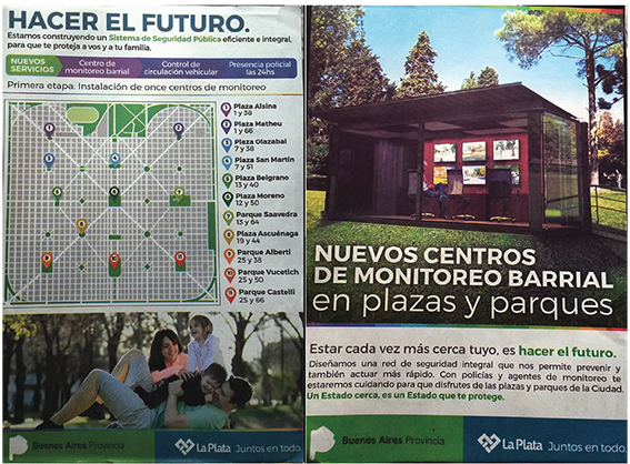La política está específicamente orientada hacia el casco urbano —donde se recolectó el folleto— reforzando la gran postergación en políticas de todo tipo que sufre el afuera del cuadrado, donde todos los indicadores de Necesidades Básicas Insatisfechas son mayores (Segura, 2015). En la construcción de estas imágenes, además del cuadrado, son pregnantes la figura de la familia tipo, la presencia estatal/policial y los espacios verdes o abiertos que son además los lugares a los que serán destinados los respectivos “Nuevos centros de monitoreo barrial”. No es menor señalar que esta política se da en un contexto previo a elecciones legislativas y ya fue señalado el peso que tienen estas temáticas: el anuncio se produjo hacia mediados de julio y en septiembre habían comenzado a construir varios de los puestos proyectados; a su vez estos once centros de monitoreo se combinaron con unas 85 cámaras de videovigilancia.