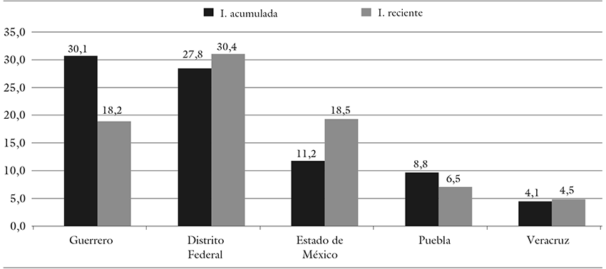 Pero no solo eso, los datos aportan otro hallazgo relevante al distinguir el origen de la migración acumulada y reciente por Estado de origen en las áreas de estudio, y es la presencia irrelevante de migrantes nacidos o con origen en el Distrito Federal (0,8 %), cuando la participación que estos tienen en el total de la migración al Estado de Morelos es del 27,8 % en la migración acumulada y 30,4 % en la migración reciente.