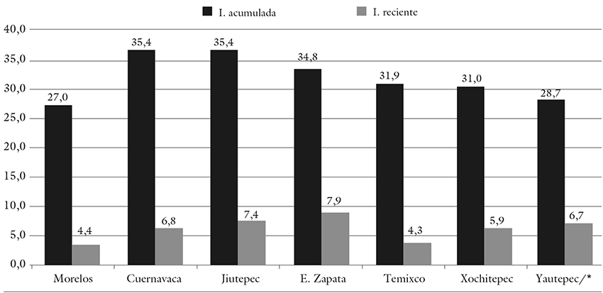 La primera diferencia es que mientras en el ámbito estatal, el 27 % de la población total es originaria de otro Estado o país (INEGI, 2010) , en los asentamientos objeto de estudio hasta el 52 % de los jefes de familia nacieron fuera del Estado. Esto es entendible por tratarse de la capital del Estado y sus municipios conurbados, que concentra los flujos migratorios; no obstante, ese dato es también muy superior al porcentaje de la migración acumulada de cada uno de los municipios metropolitanos con origen en otros estados (figuras 4, 5, 6 y 7; tabla 5). De modo que se revela, además de una concentración de la inmigración metropolitana acumulada en el Estado, una sobreconcentración de la inmigración acumulada en la periferia metropolitana irregular de Cuernavaca, mayor a la de las áreas centrales.