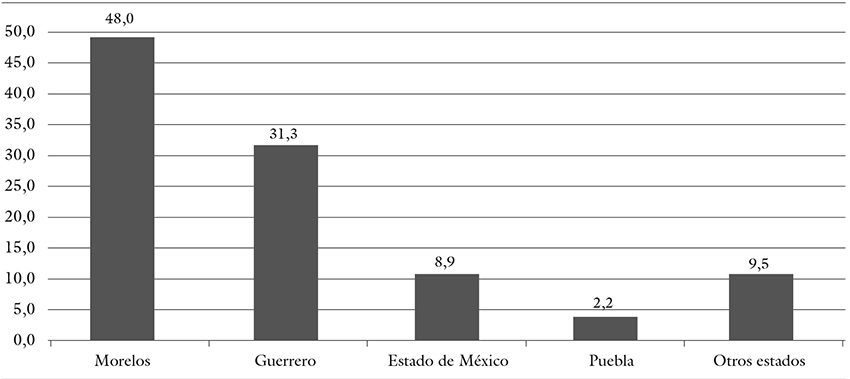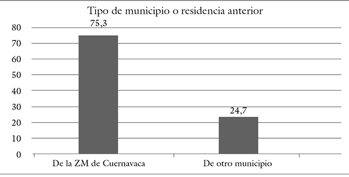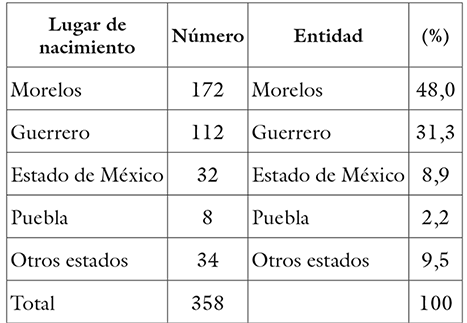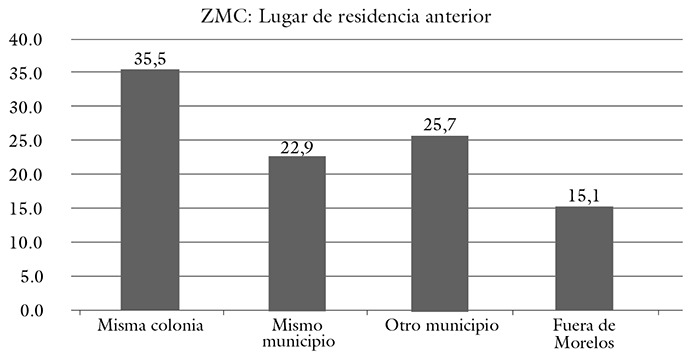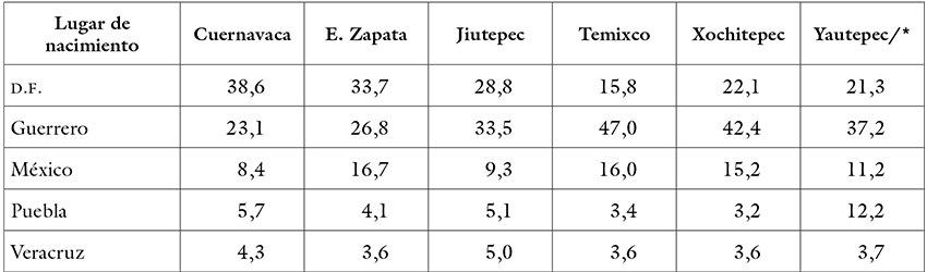 Para los inmigrantes de los estados de Guerrero y de México con residencia en las áreas de estudio, su proporción no difiere mucho de su proporción para el total estatal, con una ligera sobre-representación de Guerrero y una ligera sub-representación del Estado de México. En otras palabras, hasta ahora entre los inmigrantes de Guerrero ha sido alta la proporción de quienes han llegado en situación de pobreza y han elegido para residir asentamientos irregulares periféricos. En el caso del Estado de México los inmigrantes se localizan tanto en este tipo de asentamientos como en otros, sin más referencias precisas. Por último, 48 % de los habitantes de las áreas de estudio son originarios del propio Estado de Morelos.