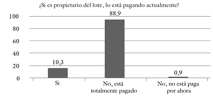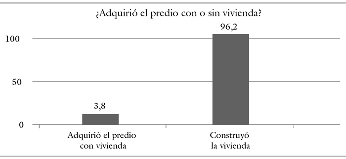 Por cuanto al precio por metro cuadrado de terreno, 63,2 % pagó como máximo 200 pesos y 25,3 % de 201 a 500. El 12 % pagó un máximo de cincuenta22. Estos precios facilitaron el acceso al suelo, primero y después la construcción de la vivienda, pues en 96,2 % de los casos los colonos que ahora son propietarios adquirieron el predio sin ninguna construcción, lo mismo que en un 89 % ya pagaron por completo.