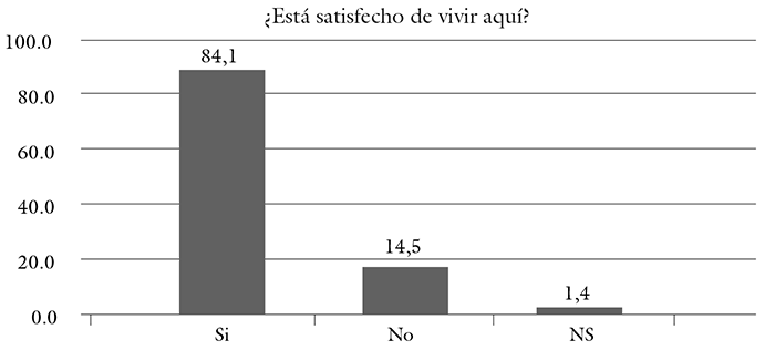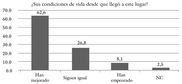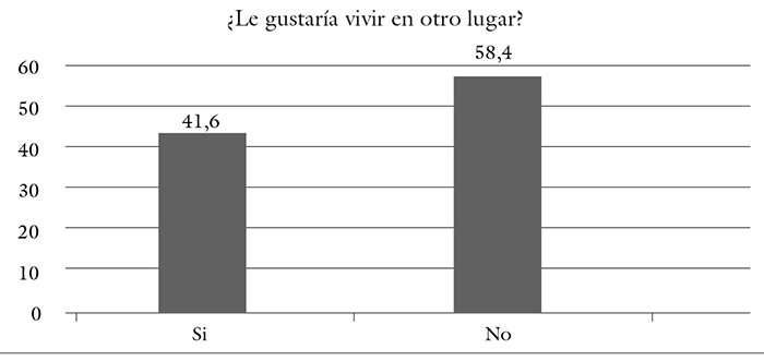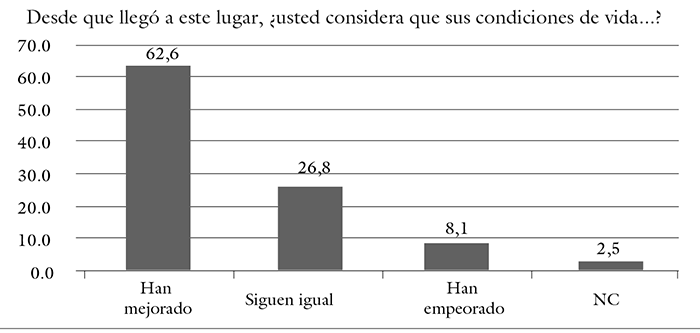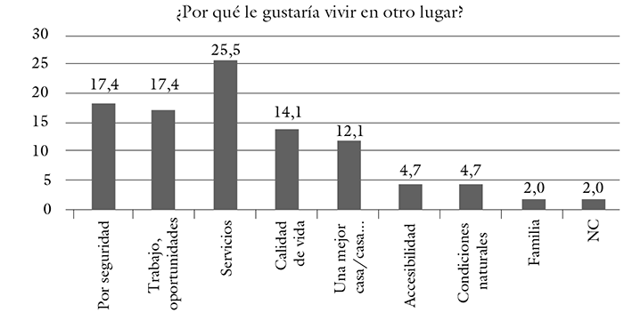 Todas estas situaciones llevan al 85 % de los entrevistados a considerar que están satisfechos de vivir en su actual domicilio. Incluso, a la pregunta de si les gustaría vivir en otro lugar, 58,4 % mencionó que no porque sus condiciones de vida mejoraron respecto a su situación anterior (6 de cada 10). El 41,6 %, empero, aun cuando una parte decía sentirse satisfecha en ese lugar, mencionó que sí le gustaría vivir en otro lugar ya que su situación no había mejorado (26,8 % del total de casos), por diversas razones; sobresale la falta de servicios o su mala calidad, su pretensión de mejores oportunidades de trabajo, o mayor seguridad. En un tercer nivel de importancia mencionaron una mejor calidad de vida y una mejor vivienda o para tener casa propia (véase anexo gráfico final).