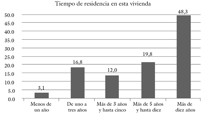 Los datos también describen a la urbanización irregular como un proceso continuo, ya que hay registro de la llegada de población en forma permanente. Desde menos de un año, de uno a tres, de tres a cinco, cinco a diez y más de diez. En conjunto, casi 52 % tiene menos de diez años viviendo en estos asentamientos irregulares y el resto diez años o más.