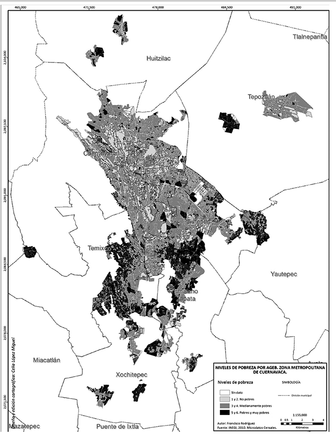 El mapa de la figura 1 es claro en cuanto al gradiente centro-periferia en la distribución de la población, según su condición de no pobre o pobre y muy pobre. Las áreas centrales del municipio de Cuernavaca, a partir de cuya expansión ocurrió el proceso de metropolización, están ocupadas por la población rica y más rica. La población pobre y muy pobre, mientras tanto, se localiza en la periferia norte y noreste de Cuernavaca, pero en mayor magnitud en los municipios conurbados al este (Jiutepec) y sobre todo al sur (Emiliano Zapata, Temixco y Xochitepec). Este gradiente de niveles de pobreza es al mismo tiempo un gradiente de precios del suelo, que en la teoría económica urbana se conoce bien que tiene igualmente una pendiente centro-periferia.