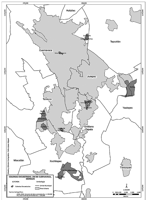 El mapa de la figura 2, donde se marcan las colonias seleccionadas para aplicar la encuesta, es consistente con la anterior afirmación. Está, no obstante, la colonia Patios de la Estación, un espacio de pobreza extrema muy cerca del centro de Cuernavaca, en un terreno de 20 hectáreas. Su excepcionalidad deriva de la desatención que diversos gobiernos municipales prestaron a la invasión de los terrenos federales de la estación del ferrocarril de Cuernavaca, que dejó de funcionar en 1987, y que actualmente es considerado “el asentamiento irregular más grande y antiguo de la ciudad” (H. Ayuntamiento de Cuernavaca 2011), con unos 10 mil habitantes.