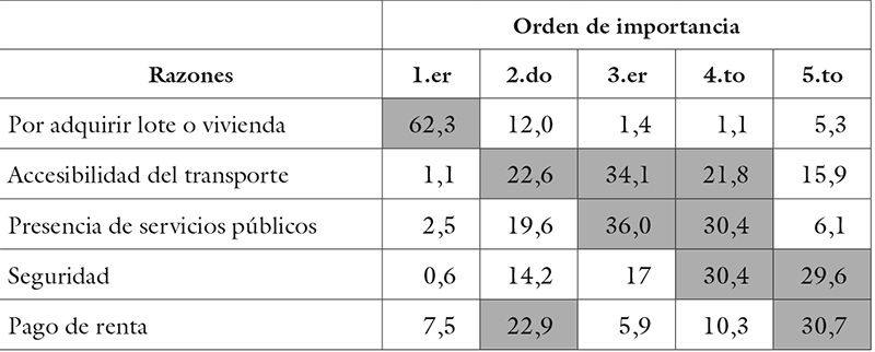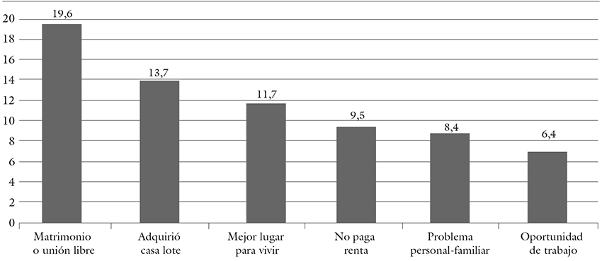 Así, la principal razón para dejar la vivienda anterior fue el matrimonio o unión, seguida de la adquisición de la casa o lote, por lo que se considera que se optó por un mejor lugar para vivir. En congruencia, la razón más importante para cambiarse a la vivienda actual fue la adquisición del lote o vivienda. Lo segundo más importante fue dejar de pagar renta (aunque también destaca esta respuesta en quinto sitio). En tercer lugar, se consideró la presencia de servicios públicos junto con la accesibilidad de la zona por existencia de medios de transporte. En cuarto orden destacó la seguridad y se le siguió dando importancia a los servicios. Por último, se mantuvo la combinación de seguridad y el no pago de renta.