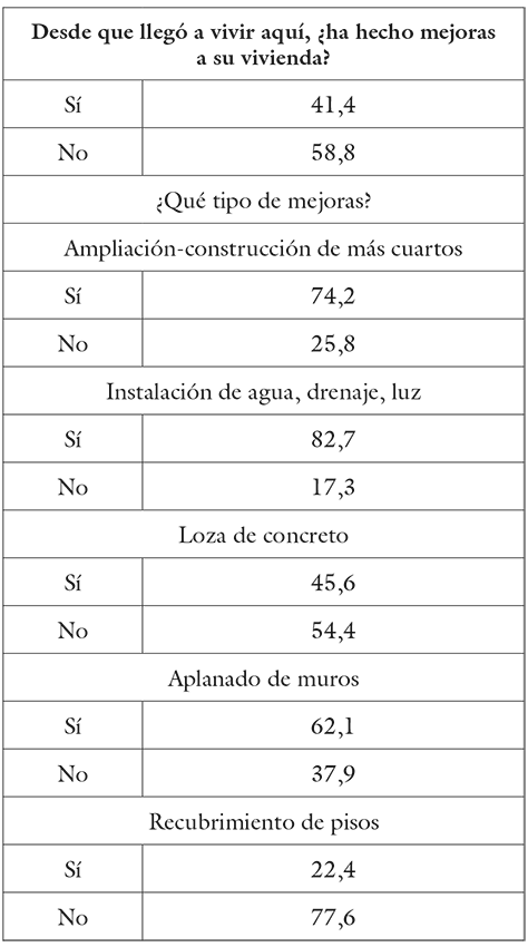 Respecto a las mejoras a la vivienda con el tiempo (tabla 8), estas han consistido en la adición o ampliación de cuartos, instalación de agua, luz o drenaje, el aplanado de muros y la sustitución de techos de lámina por loza de concreto. Por cuanto a los servicios colectivos se refiere, la organización de los habitantes ha sido decisiva para obtenerlos. Un 80 % de los colonos reconoce la labor de quienes los representan para conseguir pavimentación, agua y energía eléctrica, como principales reclamos. Estos logros se traducen en un desinterés muy marcado para regularizar sus propiedades.