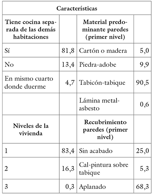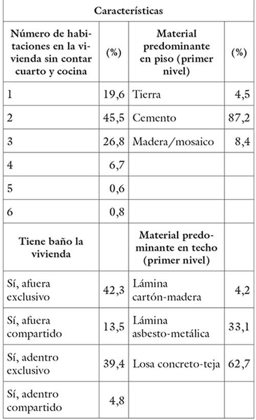 Por el tipo de asentamientos, las condiciones de la vivienda muestran su carácter progresivo al solucionar sus deficiencias con el paso del tiempo. En general, se puede hablar de un rezago cualitativo de las viviendas, pero también de un avance relativamente rápido en su solución. Entre los rezagos destaca la existencia de pisos de tierra en 4,5 % de las viviendas, la presencia de cartón o madera en las paredes y techos (5,0 % y 4,2 %), así como el uso de lámina de asbesto o galvanizada en un tercio de ellas; también en el uso de la cocina como dormitorio (4,7 %), el baño afuera de la vivienda en más de la mitad las casas y la falta de aplanado en una cuarta parte (tabla 7).