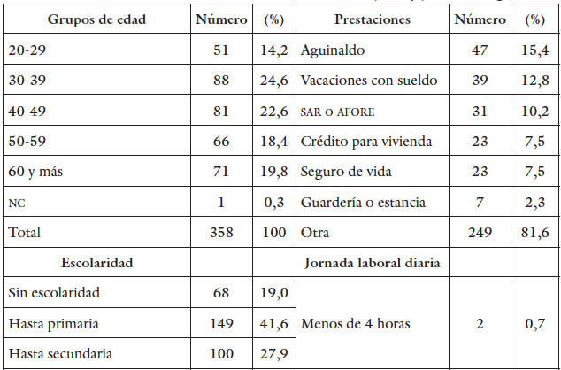 Los resultados de la encuesta validan información ya conocida sobre las características principales de los jefes de hogar en este tipo de colonias, respecto a sus bajos niveles de instrucción, su precariedad laboral y bajos ingresos. El resto de las preguntas, no obstante, así como las especificidades de la zmc, aportan información sobre situaciones menos conocidas y en concreto sobre una ciudad no estudiada hasta ahora. De inicio, 80 % de los jefes de hogar está en los grupos de edad laboral (de 20 a 59 años) y 61,4 % se concentra en las edades más activas (20 a 49 años). El 85 % tenía trabajo en el momento de la encuesta, aunque en situaciones desfavorables porque solo uno de cada diez reporta un trabajo estable vinculado a prestaciones laborales y seguridad social; el resto se divide casi en partes iguales entre trabajo sin contrato y trabajo eventual (tabla 2).