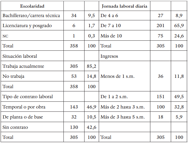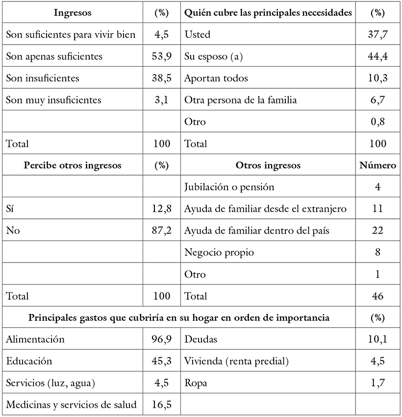 Dado lo anterior, el 54 % de los jefes de familia consideran que sus ingresos son apenas suficientes para vivir y 41,6 % que no son suficientes; solo 4,5 % reconocen que cubren de manera satisfactoria sus necesidades (tabla 3). Para completar los ingresos familiares, se ha incorporado al mercado laboral el esposo o la esposa, principalmente, en el 44,4 % de los hogares, y en el 17,0 % algún otro miembro de la familia o todos los integrantes. Solo en 37,7 % de los casos el o la jefe de familia es el único sostén económico.