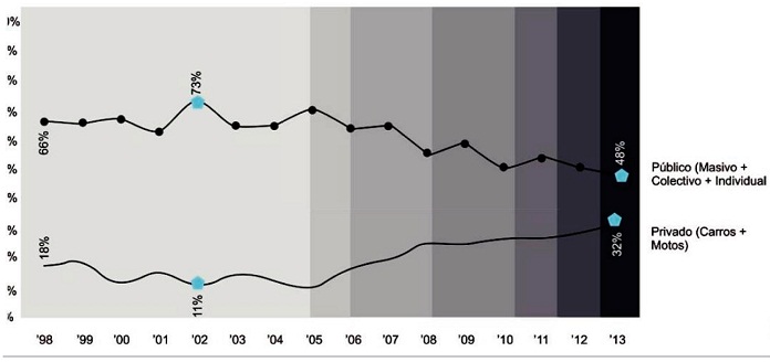 Ahora bien, en las principales ciudades de Colombia el problema de la congestión vehicular no es un tema menor. Frente a la situación caótica de movilización de un sitio a otro en una urbe se requiere cada vez mayor intervención y coordinación de la institucionalidad pública. Por ejemplo, en las últimas dos décadas, en el país hubo una tendencia que muestra cómo ha crecido el uso del vehículo particular en lugar del transporte público, lo que ocasiona y revela el fenómeno de la congestión en los contextos urbanos (figura 1).