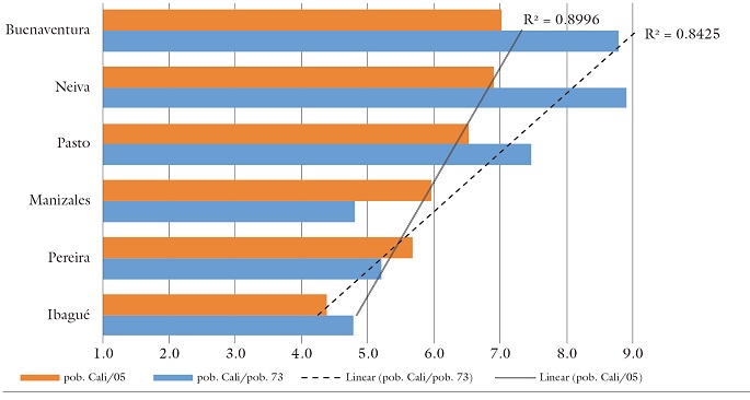 Esto significa que la primacía de Cali sobre las ciudades más importantes de la región ha estado siempre presente en esa centuria: por ejemplo, en términos proporcionales ha tenido cinco veces mayor población que las ciudades del triángulo del café (Manizales, Pereira y Armenia) incluyendo a Ibagué. Además, su evolución histórica también lo ratifica como se percibe en los censos desde 1973 hasta 2005. De igual manera, ocurre con las ciudades de Pasto, Neiva y Buenaventura, cuyas cifras indican que estos municipios tienen seis veces menos población que Cali; es decir, la importancia de la urbe caleña como nodo regional siempre se ha mantenido (figura 3).