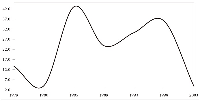 También en estas décadas, inicia el poblamiento informal y acelerado en el oriente en el Distrito de Aguablanca del cual surgen barrios como El Vergel, Charco Azul, Mojica, El Vallado, Comuneros, Marroquín, los Naranjos, el Poblado, Manuela Beltrán, Puertas del Sol, Alirio Mora, Decepaz, etc. (Mosquera, 1989; 1996). Efectivamente, como se puede ver en la figura 4, hacia finales de 1979 hubo un crecimiento importante en la cobertura de servicios públicos con tasas superiores al 35%, el cual se explica principalmente por la expansión desbordada hacia el distrito de Aguablanca, que implicó por ende la urbanización y dotación de esta zona de inversiones en los servicios básicos por más de veinte años.
