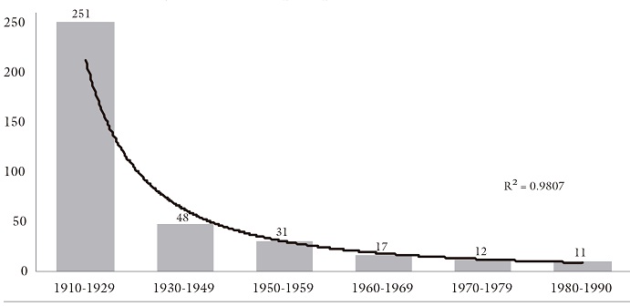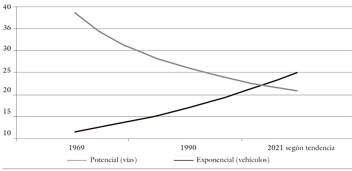 Como se puede apreciar en la figura 5, a partir del año 1950 hay un incremento considerable del parque automotor que se explica porque por cada 31 habitantes hay un vehículo; treinta años después se reduce a 11 habitantes. Como la curva es decreciente es de esperarse entonces que en el nuevo milenio esta cifra se haya reducido aún más, entre otros por la facilidad de compra de vehículos, lo cual es coherente dado el problema actual de movilidad y congestión vehicular con el que convive la ciudad.