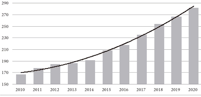 En conclusión, Cali hoy tiene problemas de infraestructura en la construcción de vías como también en la recuperación de la malla vial; además, el parque automotor está creciendo vertiginosamente a tasas superiores del 5% cada 20 años (ceterisparibus).8 Por tanto, se debe tener presente que hay serios problemas de congestión y tráfico vehicular. Entonces tomando en cuenta la proyección al año 2021 en lo que significa la reducción de la malla vial y el escenario tan caótico, la respuesta en los próximos años es que el parque automotor deberá desbordarse por encima de la actual infraestructura vial. En consecuencia, aumentará en peores condiciones el problema cotidiano de la congestión y el tráfico vehicular dado que el parque automotor está en pleno crecimiento (figura 7).