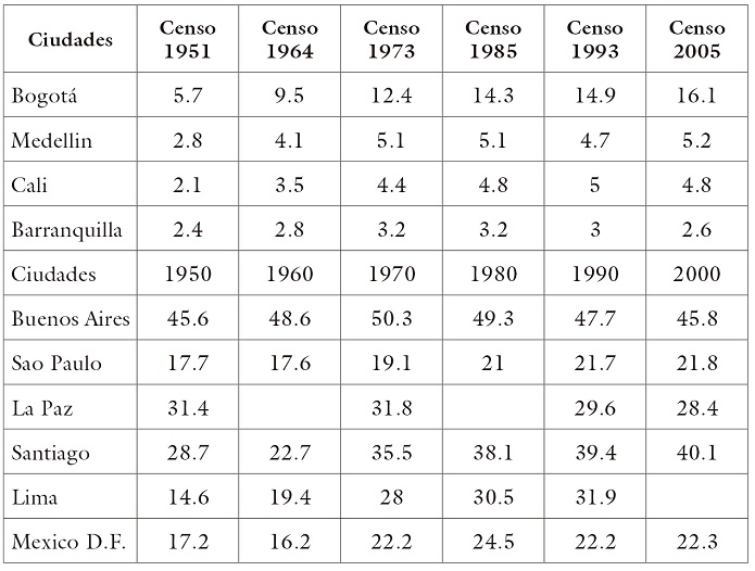 Al comparar el total porcentual de las ciudades colombianas en relación con las capitales de los otros países latinoamericanos por años y censos, nuestro referente urbano sigue siendo inferior en cantidad poblacional frente a la gran metropolización de Buenos Aires, La Paz y Santiago de Chile. De igual manera, cabe mencionar y también comparar que solo Bogotá como urbe sigue teniendo menos población que São Paulo, Lima y México D. F.