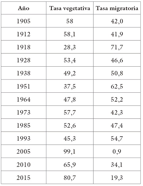 Como se evidencia en la tabla 2, en los últimos 106 años (1912-2018), la población de Cali ha aumentado de forma importante. Al hacer una clasificación en relación al desarrollo urbano y en el contexto de este trabajo se encuentra que entre 1912 y 1951 la población incrementó 10 veces en tamaño. De 1951 a 1985, la población se quintuplicó y para los últimos 34 años se duplicó. Ahora, si analizamos la tasa migratoria y su contribución a la tasa total encontramos lo siguiente.