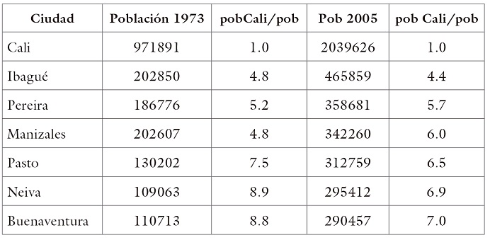 Desde 1973 hasta el último censo (2005) Bogotá, Medellín, Barranquilla y Cali concentran el 30% de la población en Colombia.1 A partir de 1985 la ciudad de Bogotá tiene un ligero incremento (al ser la capital del país el mayor receptor de las regiones). Finalmente, se puede corroborar que Cali frente a la capital colombiana tiene aproximadamente una proporción de uno a tres; es decir, desde 1951 Bogotá en términos poblacionales y espaciales es tres veces mayor en extensión que Cali.